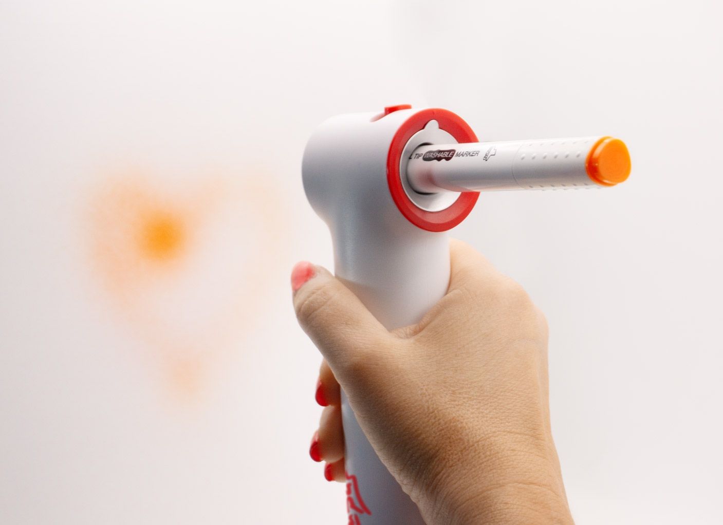 Die Stifte werden mit der dünnen Spitze in die dreieckige Düse gesteckt. Der Sprüher erzeugt feine Partikel und ein gleichmäßiges Farbbild. Je nach Entfernung zum Objekt werden die Farben feiner oder kräftiger aufgetragen. Die Stifte können ganz einfach gewechselt werden.